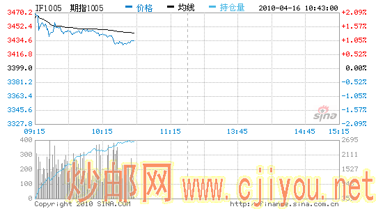 快讯:期指主力合约冲高回落 跌破开盘价 日期:2010-04-16 2010年04月16日 09:52 新浪财经 查看最新行情 新浪财经讯 4月16日,股指期货正式上市交易,主力合约IF1005开盘报3450点,高开51点。 截至上午9点50,IF1005合约报3445点,涨幅1.38%,已经跌破开盘价。该合约一度冲高至3488点,后逐渐震荡回落。