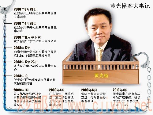 2008年11月18日,黄光裕涉嫌内幕交易罪案发,被北京市公安局监视居住;2009年3月2日被实施逮捕;9个月后,黄光裕案因一项新的罪名———单位行贿罪被退回补充侦查。