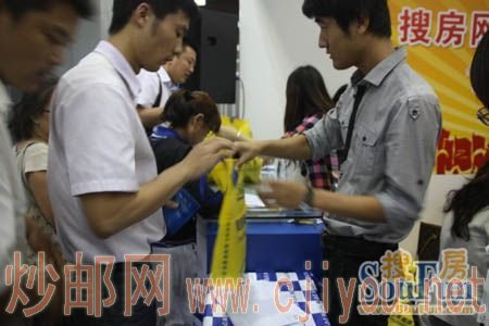 工作人员在为办理搜房卡的购房者递搜房袋子(摄像:常新芳)