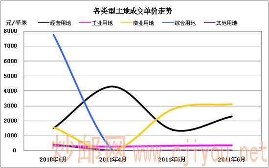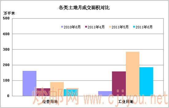 2011年6月天津成交土地49宗,总体环比上升19.51%,其中经营用地5宗,环比上月的8宗下降37.5%,工业用地28宗,占总用地数的57.14%,商业用地为5宗,占总用地数的10.2%。