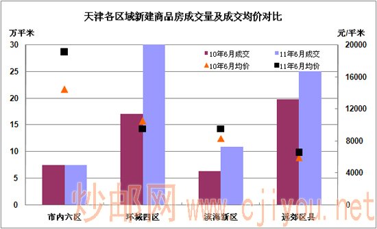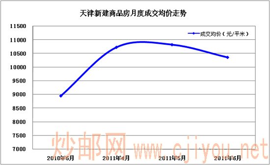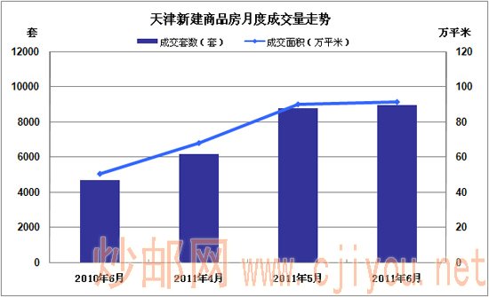 2011年6月,天津商品住宅销售8963套,环比上月8781套上升了2.07%,同比去年上升了92.22%。成交91.11623万平方米,环比上月上升了1.51%。天津商品住宅销售均价10355 元/平方米,环比下降了4.40%,同比去年上升了15.60%。