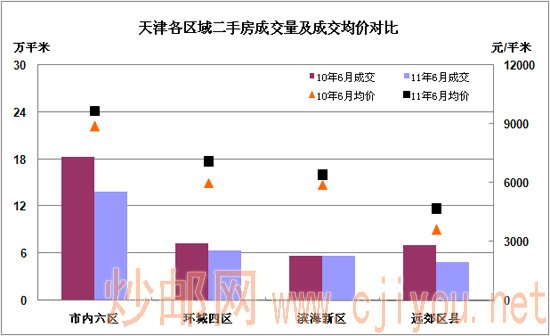 市内六区、环城四区、滨海新区、远郊区县这四个区域的二手房,同比去年在成交均价都有所上升,成交量上有所下降,远郊区县二手房的成交量4.90291万平方米同比去年7.04307万平方米下降30.39%,成交均价为4657 元/平方米,同比去年的3592 元/平方米上升29.63%。