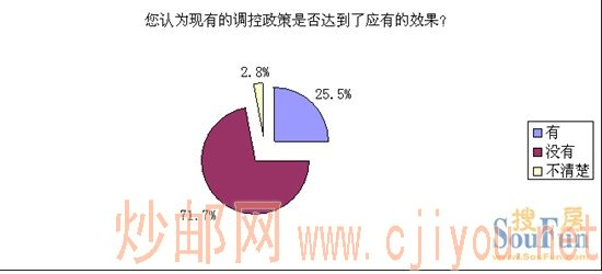 上海搜房网最新调查显示:71.7%的网友认为调控政策没有达到应有效果,25.5%的网友认为调控有效,还有2.8%的网友表示不清楚。