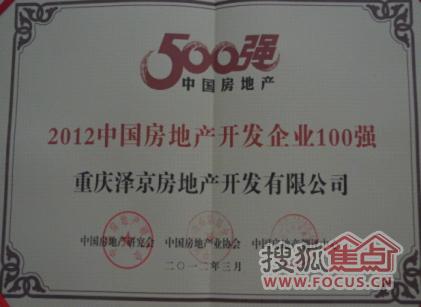 2012年3月21日,由中国房地产研究会、中国房地产协会举办的2012中国房地产500强测评成果发布会在北京盛大举行,共有11家西部企业跻身百强。其中,重庆泽京房地产开发公司与龙湖、金科、隆鑫、协信等五家重庆房企,成为2012中国房地产百强企业。