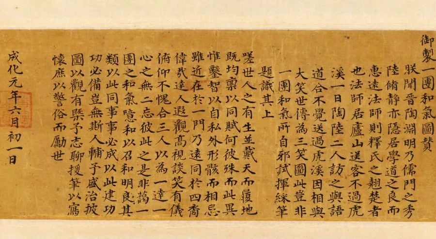 朕闻晋陶渊明乃儒门之秀,陆修静亦隐居学道之良,而慧远法师则释氏之翘楚者也。法师居庐山,送客不过虎溪。一日,陶、陆二人访之,与语,道合,不觉送过虎溪,因相与大笑,世传为三笑图,此岂非一团和气所自邪?试挥彩笔,题识其上: