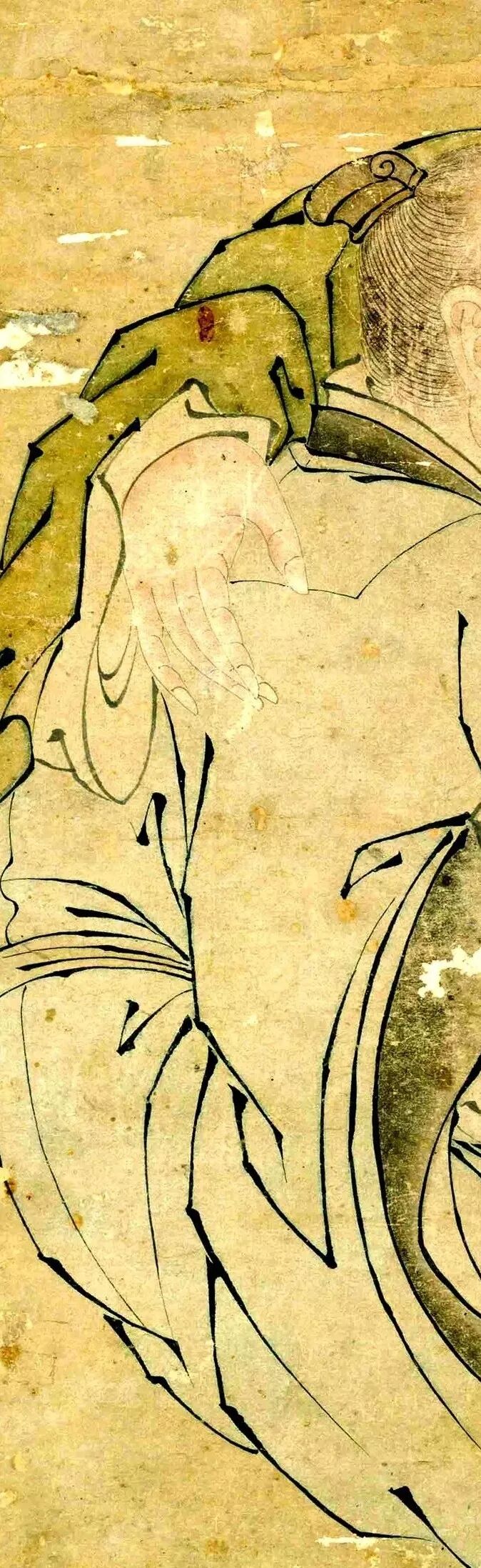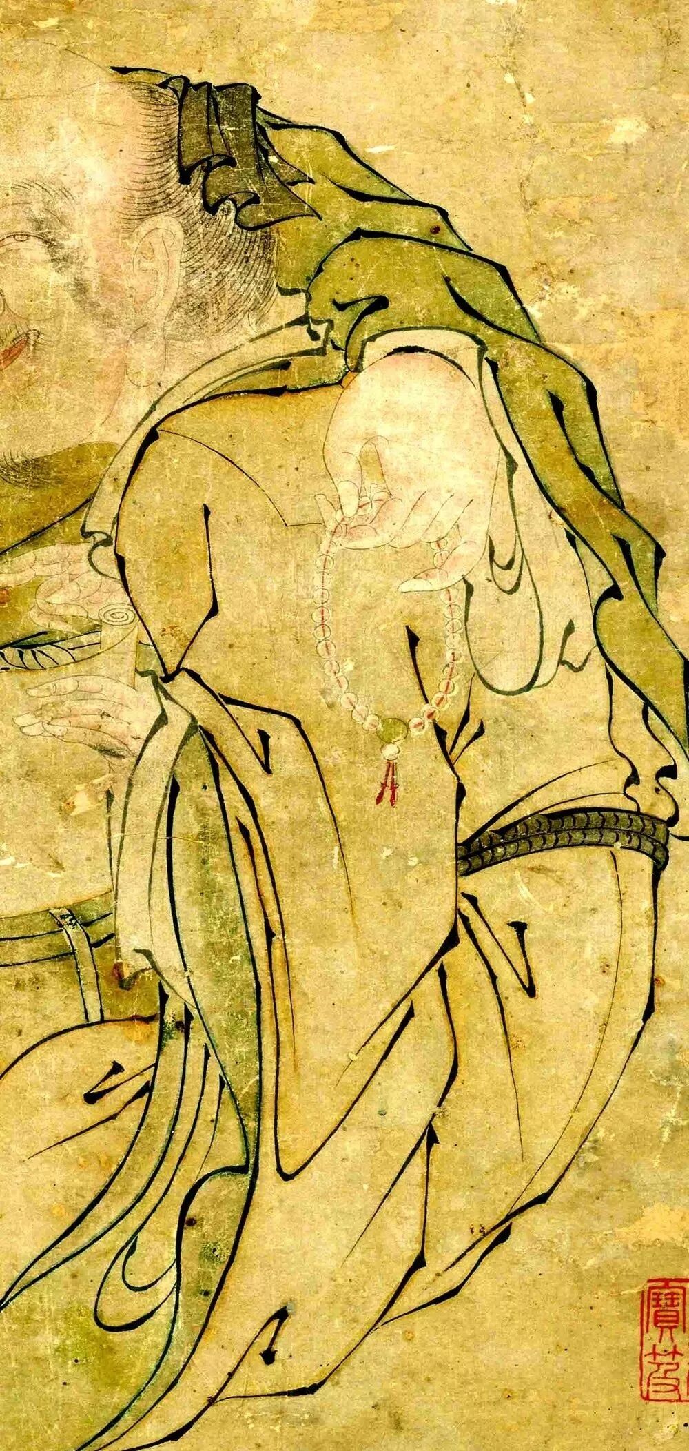 其中,左首为一着道冠的老者;右首为一戴方巾的儒士;二人各执经卷一端,团膝相接,相对微笑。第三人则手搭两人肩上,面部被遮,只露出光光的头,一手轻捻佛珠,是佛教中人。