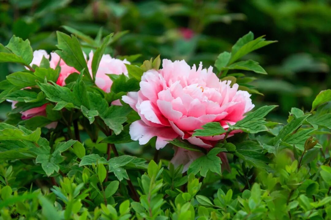 芍药叶片狭长,颜色浓绿,叶片繁密且不会开裂。