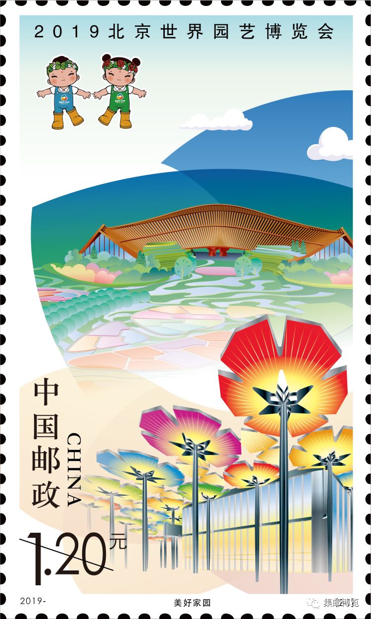 “北京世园会”邮票第2枚“美丽家园”,以本次世园会国际馆、中国馆以及吉祥物“小萌芽”“小萌花”为主要元素,整体画面生机盎然、朝气蓬勃,启示人们应当树立绿色、低碳、环保的生产生活理念,共同建设多姿多彩的美丽家园。