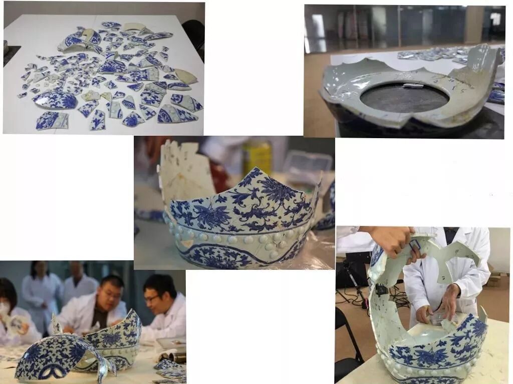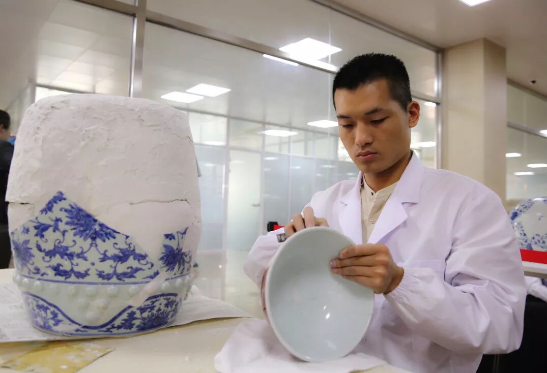 文物修复既要保持文物历史真实性,同时还要体现其美学价值,文物修复专家经过分拣、清理、粘接、补配、找平、做色、绘纹饰、上釉、做效果、拍照归档、形成工作日志及评审等步骤,将破碎的文物修复完好。