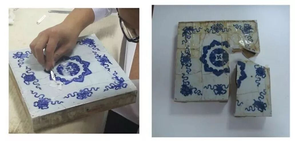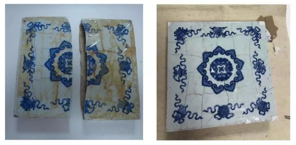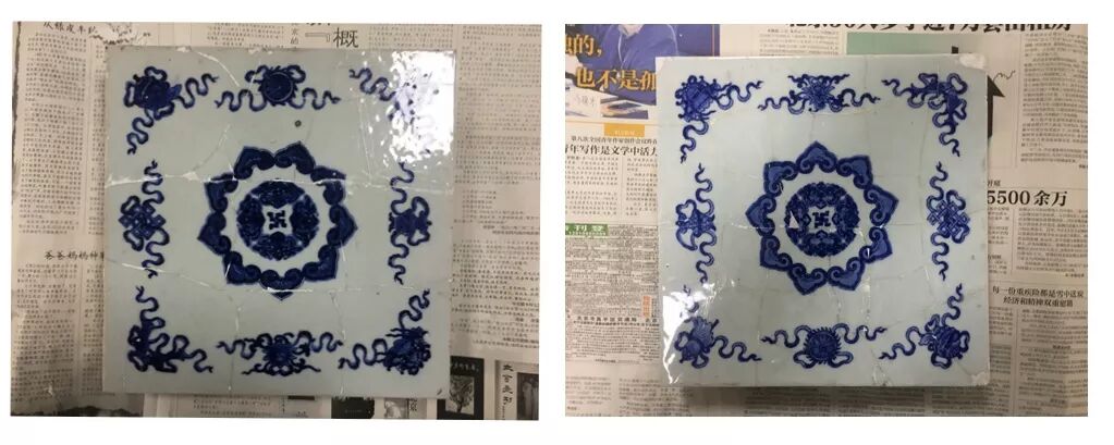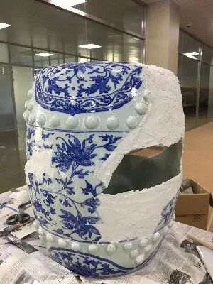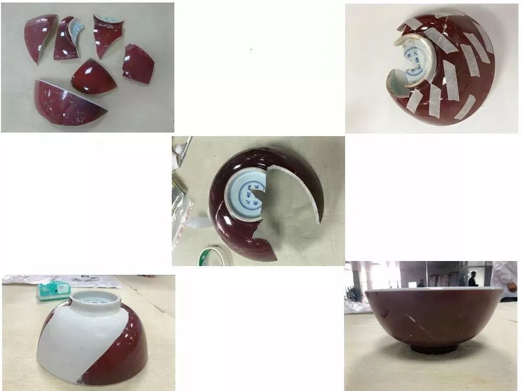 近期,圆明园启动“修复1860”,将持续修复圆明园出土的文物。现有6件精品瓷器正在修复中,分别是1件青釉鼻烟壶、2件青花八宝万福如意瓷砖、1件康熙青花龙纹碗、1件康熙红釉碗以及1件青花缠枝莲纹瓷绣墩。这6件瓷器均破损缺失严重,其中鼻烟壶断裂有冲线;两件瓷砖断裂,釉面多处冲线;瓷碗严重破碎,已从280多块碎片中查找,并拼出大致结构;红釉碗破碎并有多处缺损;绣墩碎成130余块碎片并有多处残缺。