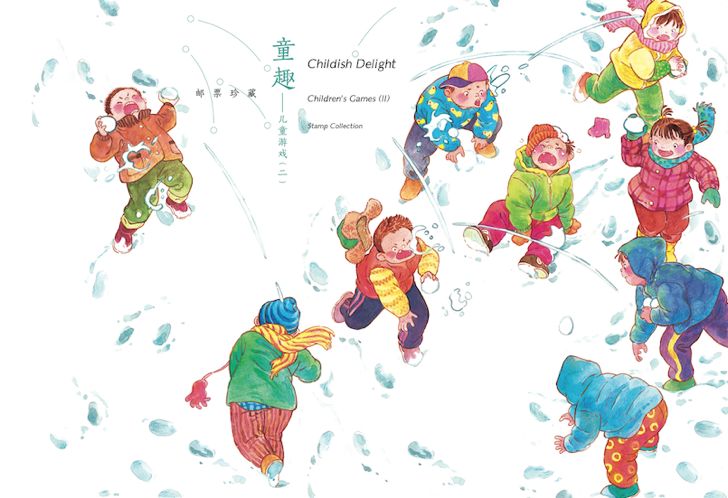 随着北京成功申办2022年冬奥会,冰雪热潮已席卷而来,“冰雪”成为当下最流行、最时尚的运动选择。在每个人的童年中,打雪仗绝对是所有小朋友“最熟悉的游戏”之一。因此,邮折封面选用景绍宗绘制的小朋友聚在一起打雪仗的场景,孩子们天真烂漫,惟妙惟肖的表情和动作,表现出了儿童对打雪仗游戏的热爱;让人们在37℃的高温下也能体验冰凉“冻”感。