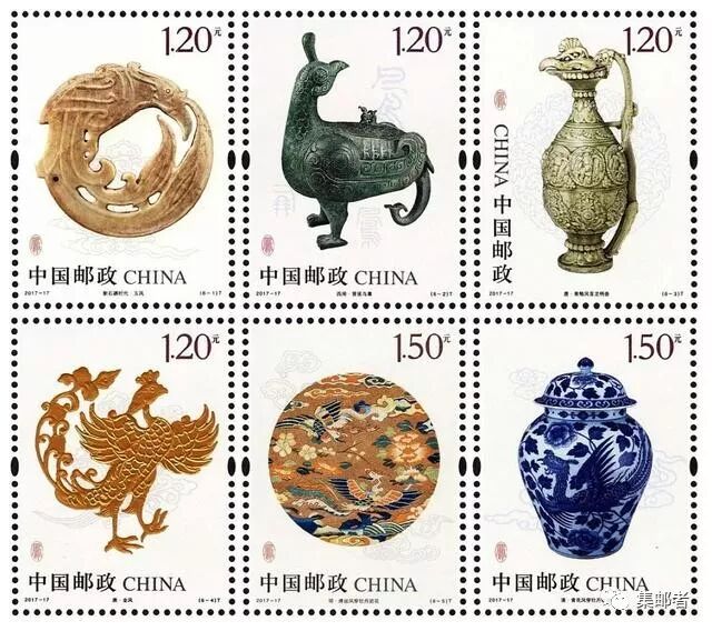 中国凤文化凭借着历代文物源远流传、传播广泛、影响深远。中国邮政曾发行的《凤(文物)》特种邮票一套六枚,图案内容分别为:新石器时代玉凤、西周晋侯鸟尊、唐青釉凤首龙柄壶、唐金凤、明缂丝凤穿牡丹团花、清青花凤穿牡丹纹罐。