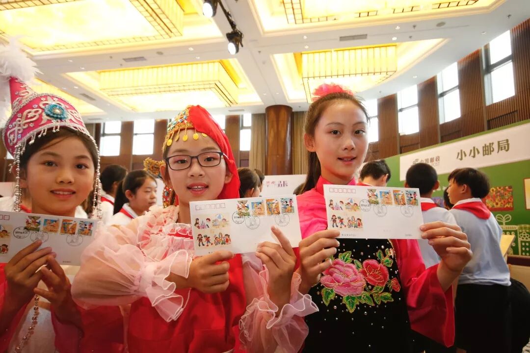 ▲身着各民族服装的小演员们在小小邮局前展示今天首发的邮票首日封。