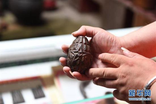 6月12日,罗小龙在展示一枚印有苏区标志的手雷。新华社记者 周密 摄