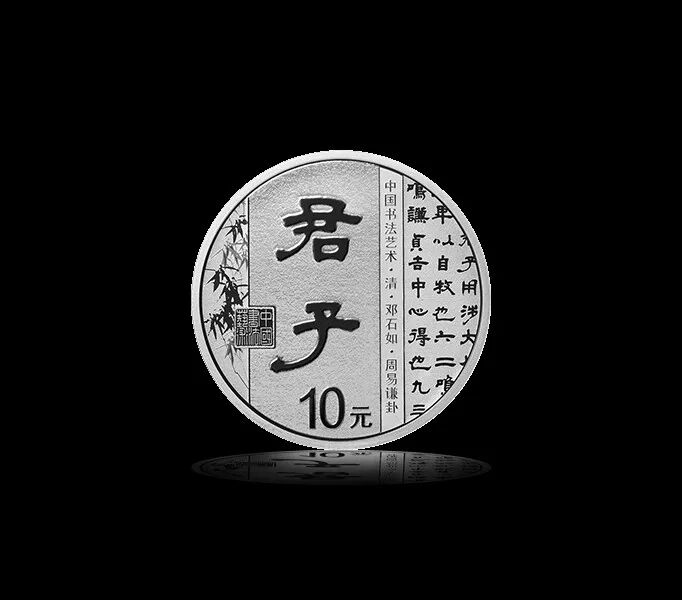 币面文字“君子”取自邓石如的隶书《周易谦卦》中“劳谦君子,万民服也”。大意是,勤劳且谦虚的君子,百姓诚服。