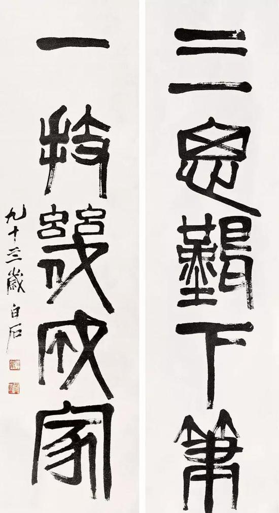 梅墨生:“老人喜爱见情性、易表现的行草体势,同时也喜爱开合大、有装饰美感的篆隶体势,事实上,为行为草为篆为隶都已‘着我之色彩’,无不强烈地闪烁着齐白石的人格精神与审美理想合一的光芒。严格而言齐白石只擅作行、篆二体。”