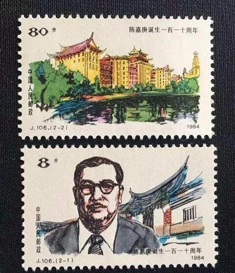 △为表彰陈嘉庚先生的巨大贡献,1984年,中国人民邮政发行了纪念邮票一套两枚。