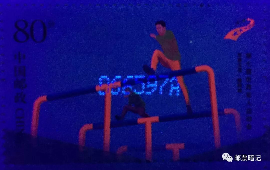 邮票暗记为数字“7”,寓意为“第七届世界军人运动会”。