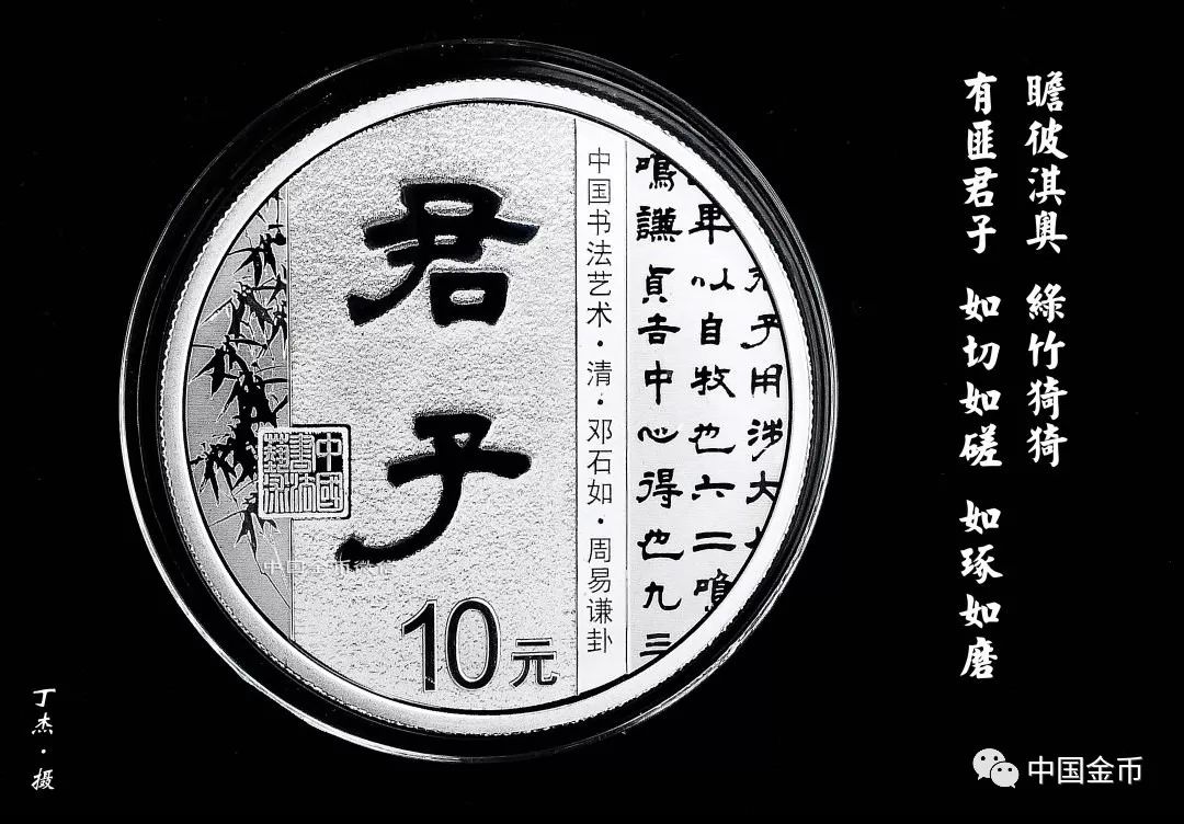 “君子”二字置于币面中心,字形厚重而不呆板。在布局上借鉴了国画留白的手法,通过适当的空白衬托“君子”之意境。工艺上,“君子”二字采用抛光做亮,其蕴含的思想在币面熠熠生辉。