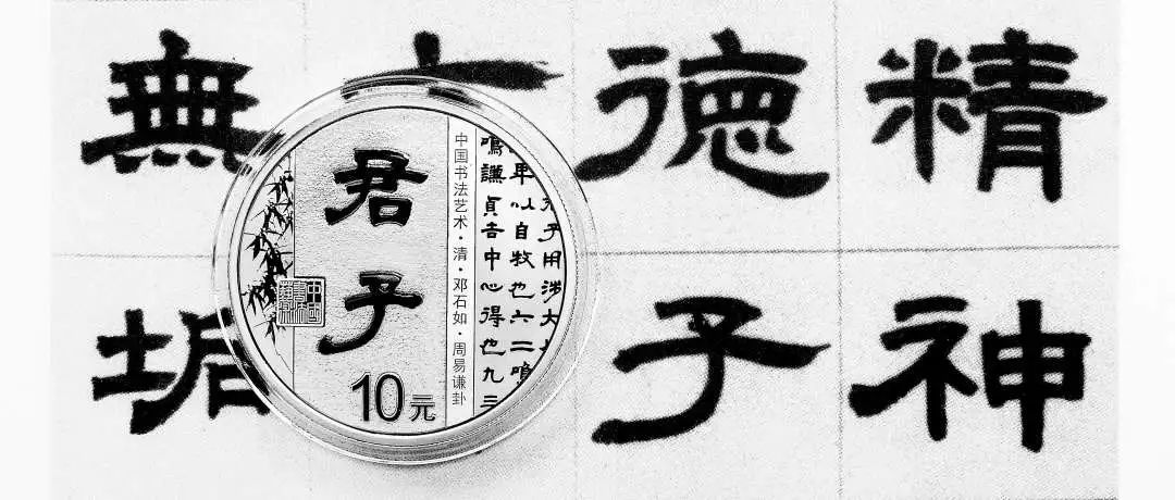 《周易谦卦》是邓石如晚年代表作,其结体紧密,貌丰骨劲,大气磅礴。币面文字“君子”取自邓石如《周易谦卦》中“劳谦君子,万民服也”。大意是,勤劳且谦虚的君子,百姓诚服。