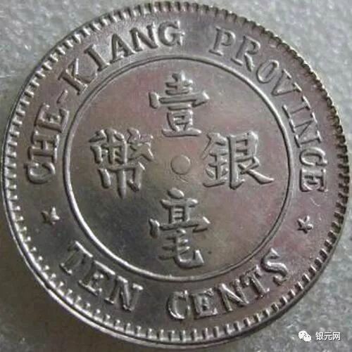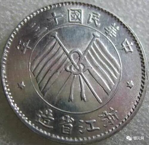 二角银币,正面上为中华民国十三年,下为浙江省造,中央圆圈内为银币贰毫四个字,正中心有一个点。背面四周为英文,中央圆圈内为20字。由于铸造及存世量特别少,很难见到。