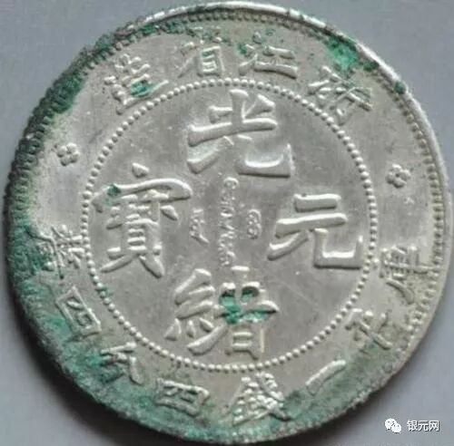 本人收藏的浙江省造光绪元宝1 .44(贰角) ,正面上面文字是浙江省造,下面为库平一钱四分四厘,正中圆圈内为光绪元宝四字及满文。龙图面,龙上英文为CHEH – KIANG PROVINCE ,下英文为 1 MACE AND 4 . 4 CANDAREENS,两边中间为小花。