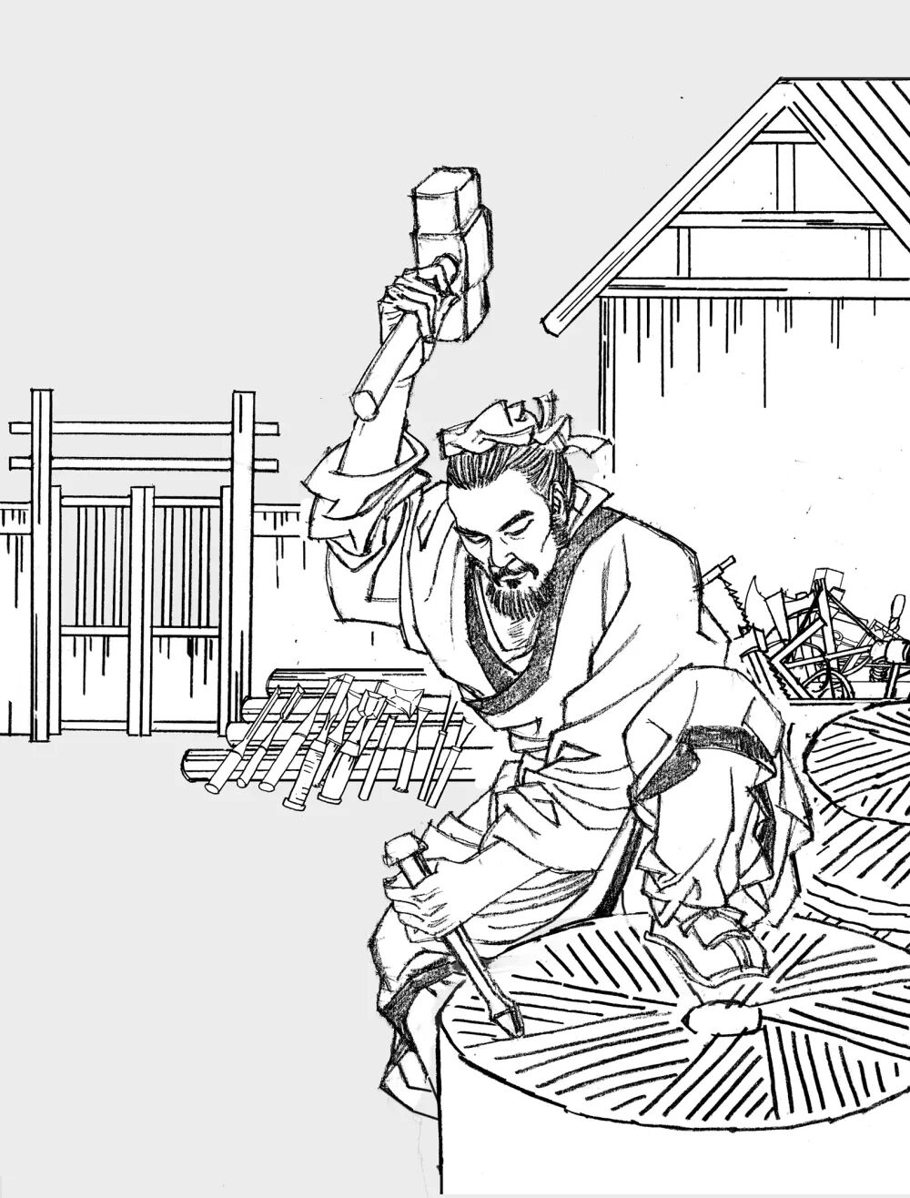 体现在画面上,孟繁聪着力描绘鲁班工匠与智者结合的形象。不光是动手,还勤于动脑,应该说是抓到了人物的核心特质。他说,不想把鲁班画成那种体格健壮的纯劳动者形象。而这也是最难画的。