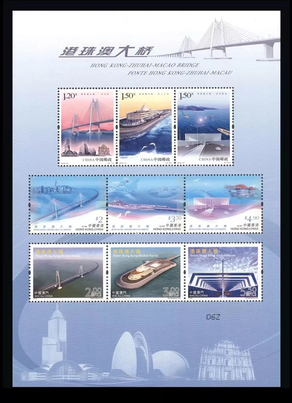 2018年10月30日,为纪念港珠澳大桥正式通车,中国邮政、香港邮政、澳门邮电共同发行了《港珠澳大桥》邮票小全张1枚,内含中国邮政、香港邮政、澳门邮电邮票各3枚。