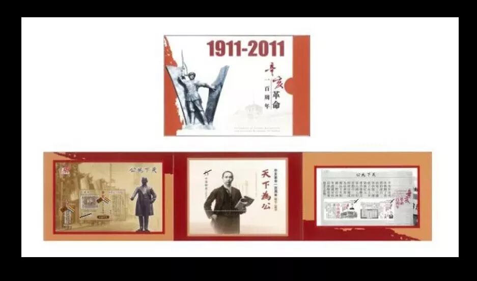 中国邮政、香港邮政、澳门邮电共同发行《辛亥革命一百周年》小型张本票1本,内含中国邮政、香港邮政、澳门邮电小型张各1枚,3枚小型张连印,也采用了风琴折式样。