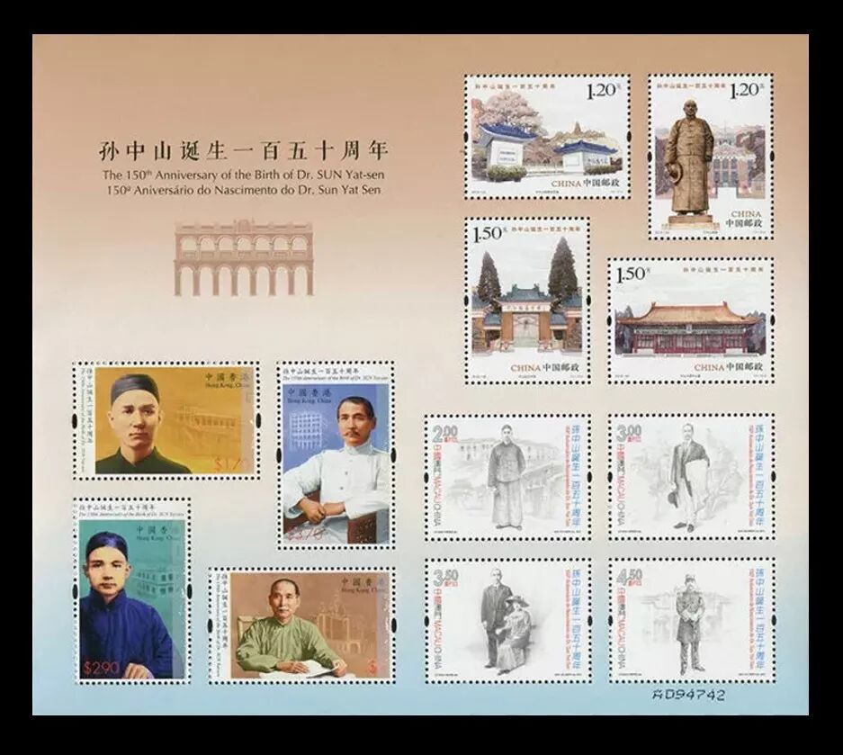 中国邮政、香港邮政、澳门邮电共同发行了《孙中山诞生一百五十周年》邮票小全张1枚,内含中国邮政、香港邮政、澳门邮电邮票各4枚。