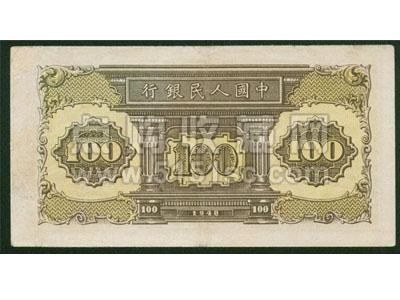 第一套人民币壹佰圆工厂与火车正面左侧有工厂图,右侧有火车图,主色为蓝黑色;背面为花符,主色为灰黄色。俗称“黑工厂”,以区别于“红工厂”票券。