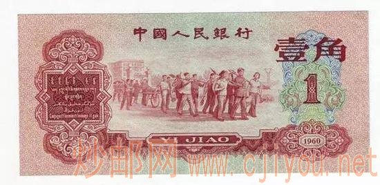 枣红一角又是一张带有政治色彩的纸币,正面主图案的劳动者向右走。在那个年代,右倾主义是被打击改造的对象,于是这枚小小的纸币一度引起了一阵轩然大波,被认为是传播右倾主义的纸币,枣红在那样的年代根本无法流通了,在使用了几年后就被背绿所取代。目前一张全新品相的红一角市场价在4000元左右一张。