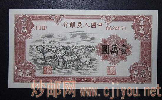一万元人民币牧马图不仅流通的时间极短,它的发行量也是相当的少,而且在当时的那个年代,人们根本没有收藏意识,因此就造成了大量的消耗和磨损,真正完整保存下来的极少。根据统计,一万元牧马图的总量也只有十几枚,想见到它基本只能靠缘分,由此可见它的珍贵程度。