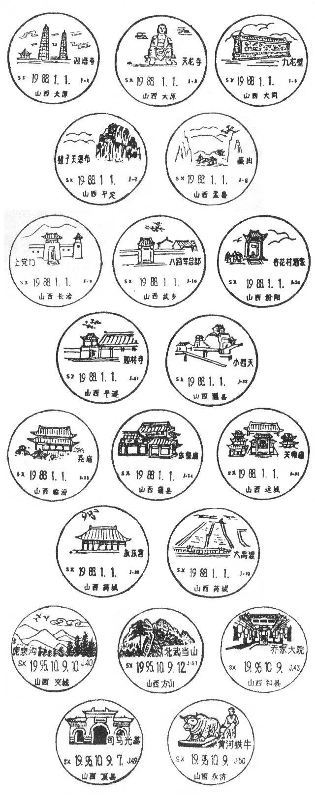 值得一提的是,山西省自刻制第一批风光日戳起,就对本省的风景日戳进行了统一编号。编号以“SX、J”作为冠字,取“山西”和“景”字的汉语拼音首字母,这样的编号不仅利于管理,也方便集邮爱好者收集。