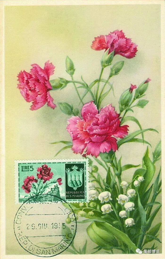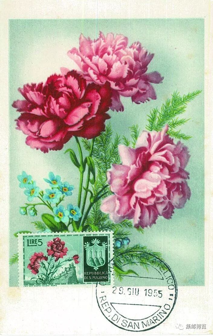 早在1955年6月29日,位于欧洲南部的圣马力诺曾发行了“康乃馨”邮票,以2枚康乃馨图案的明信片为载体,贴这枚邮票后盖圣马力诺邮政日戳制作而成2枚极限片,非常漂亮。