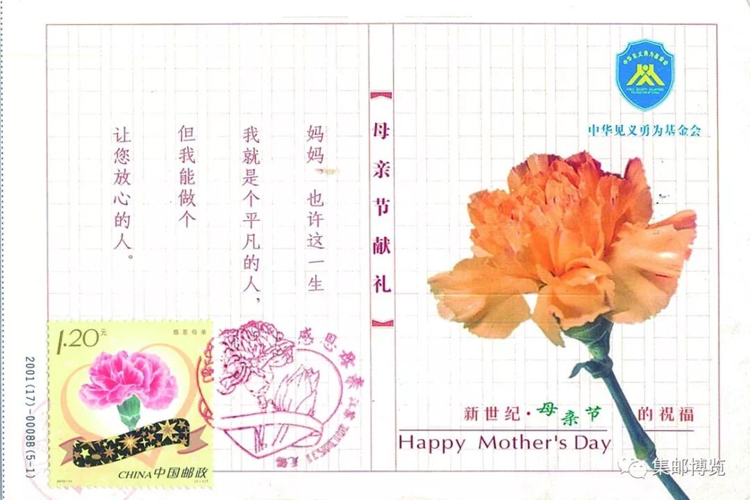另一枚选用了2011年国家邮政局发布的康乃馨60分邮资明信片,是中华见义勇为基金会加印的宣传明信片,片上有一束康乃馨鲜花,配有母亲节的祝福语,加盖无锡集邮公司刻制的纪念邮戳制作而成。