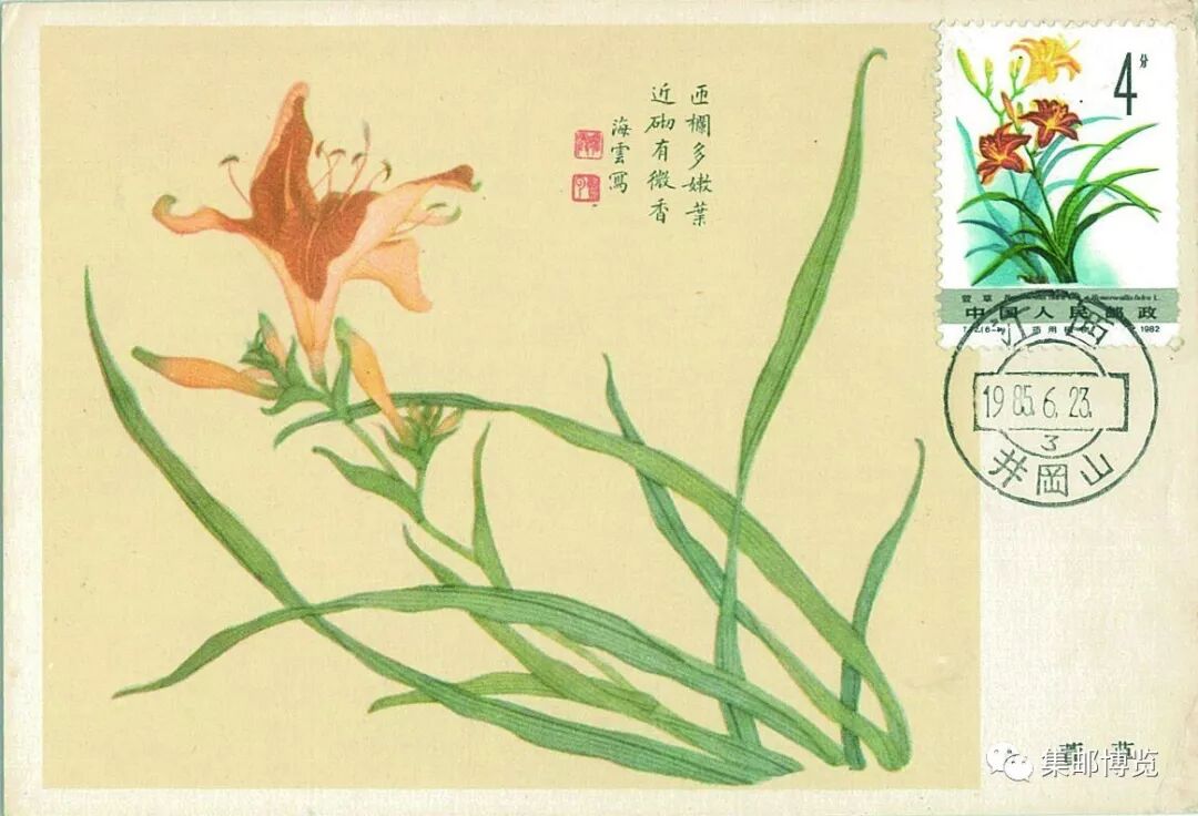 第一枚极限片的载体选用了1959年朝花美术出版社印制的《花卉》套片中的“萱草”明信片,这是画家王海云创作的绘画片,贴“萱草”邮票后加盖江西1985年6月23日井冈山文字邮戳制作而成。