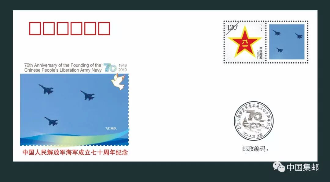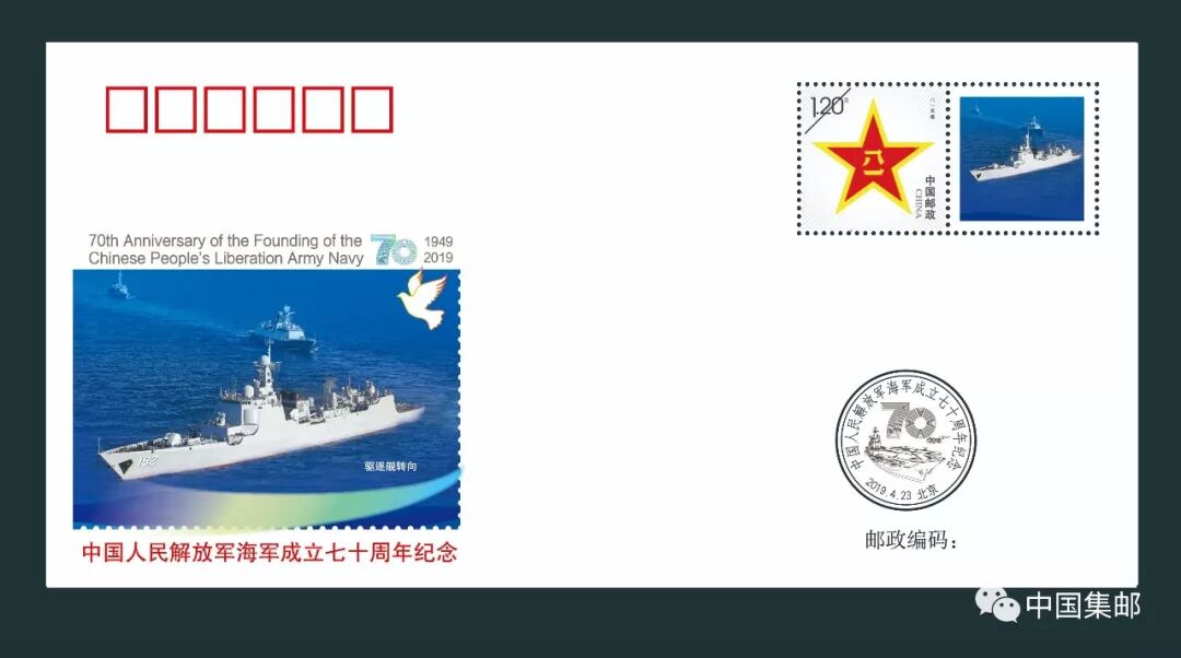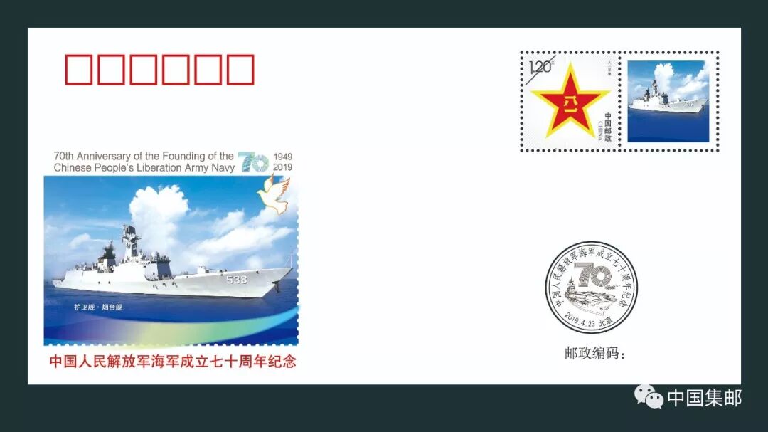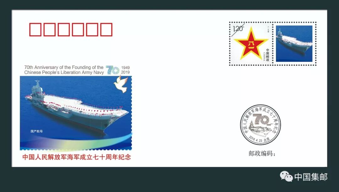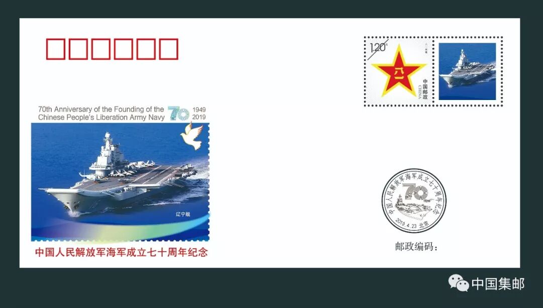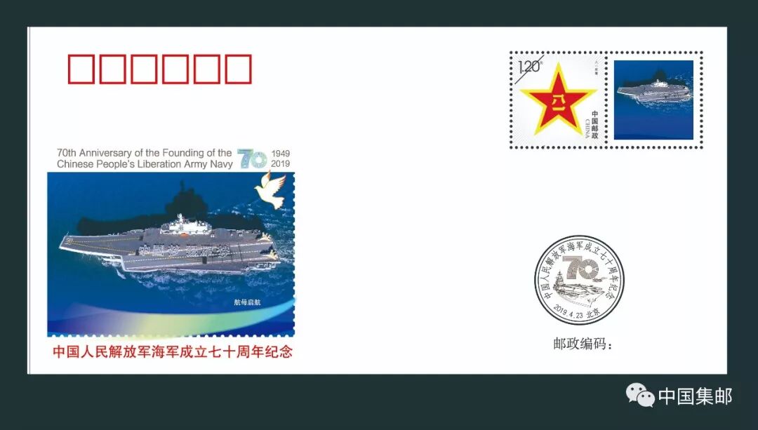 《中国人民解放军海军成立七十周年》纪念套封一套30枚,每枚封贴八一主图个性化邮票一枚。该产品用权威图片精美呈现国人瞩目的首艘航母辽宁号和首艘国产航母,驱逐舰、护卫舰、舰载机飞行编队等舰队英姿。