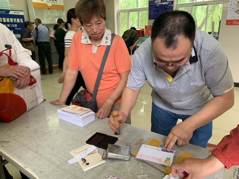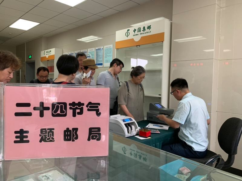 9点一开门,二三十位集邮爱好便蜂拥而至,聚集在营业大厅,排在前面的几位邮友都是资深的机戳集藏爱好者,他们每人都手握数百封信件,等待加盖“芒种”戳。家住的朝阳区慈云寺附近的张先生,排在了第五名,他一直是二十四节气戳的“忠实粉”,当然每次也不忘给远在外地的家长寄一张盖有节气戳的明信片,他说:“我特别喜欢二十四节气这个主题系列邮戳,觉得特别有中国人的味道,每次出新戳我都会来,就是为了要寄给家乡的亲人。特别是今年是芒种戳正好在端午节前,更能表达我对他们深深的祝福。其次,我很喜欢地安门支局推出的各种宣传戳,从‘戳’文化里学习到了许多书本上看不到的传统文化。”80多岁的常老冒雨赶来,盖完“芒种”戳后喜笑颜开。共和国同龄人魏先生是集邮戳的老邮迷,他手上的加盖的纪念封都是他自己设计和绘画的,每次二十四节气邮戳出炉他都会准时赶到,还与同好们一起畅谈集戳故事。