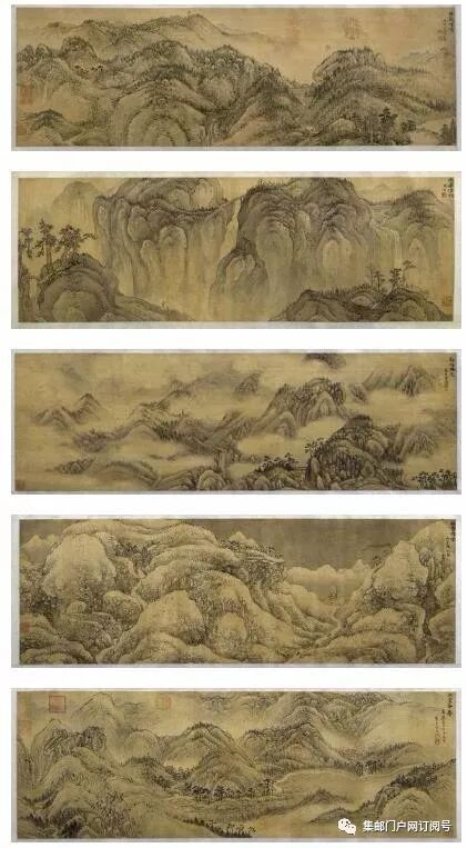 2019年的古画题材邮票以代表中华的“三山五岳、五湖四海”为出发点,选取《五岳图》发行。集邮门户网了解到,《五岳图》藏于故宫博物院,明代宋旭绘,绢本设色。展示了泰山、衡山、华山、恒山、嵩山五岳名山的风光,展现了祖国的大好河山。5枚邮票分别为:日观晴曦、太华清秋、融峰两色、恒塞积雪、二室争奇。