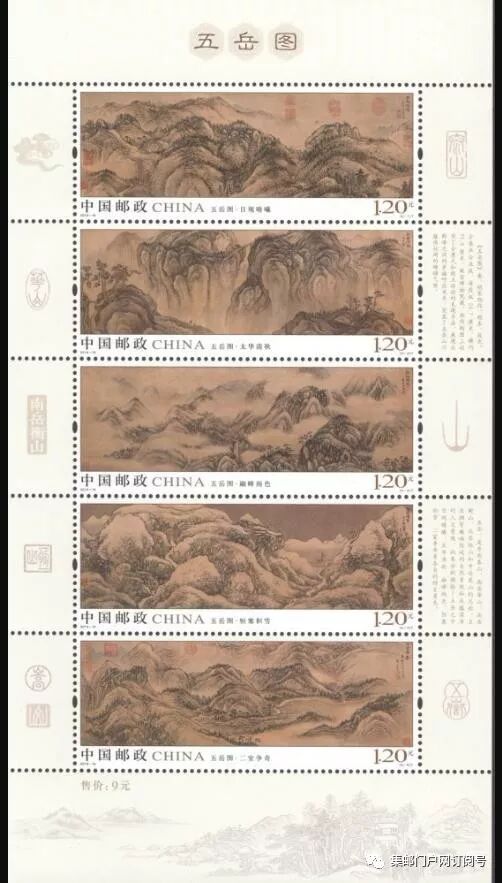中国邮政定于2019年8月3日发行《五岳图》特种邮票1套5枚,小全张1枚。邮票图案名称分别为:日观晴曦、太华清秋、融峰雨色、恒塞积雪、二室争奇。全套邮票面值为6元,小全张售价9元。