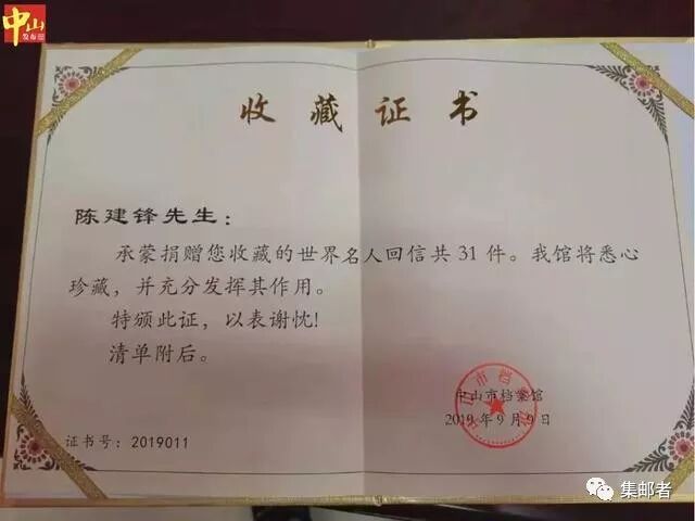 昨天上午,陈建锋决定把政界、文艺界名人的数十封回信,捐赠给中山市档案馆。