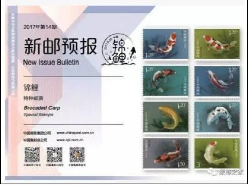 中国邮政原定于2017年6月25日发行2017-14《锦鲤》特种邮票1套8枚(图1)。