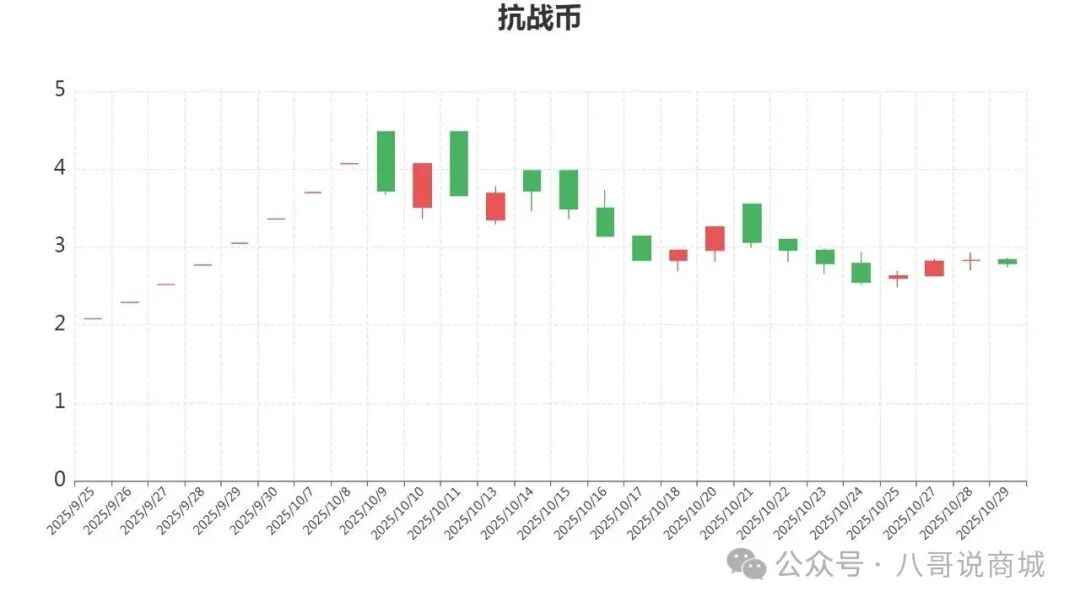 抗战币,活跃度不错,有可能超世博币,开盘2.84元,最高2.86元,最低2.74元,收盘2.79元.跌1.41%