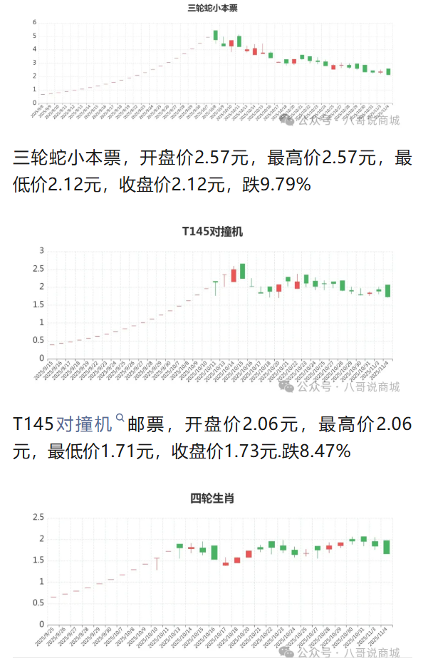 T145对撞机邮票,开盘价2.06元,最高价2.06元,最低价1.71元,收盘价1.73元.跌8.47%