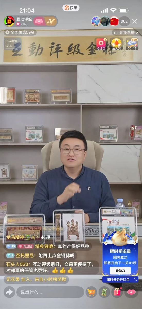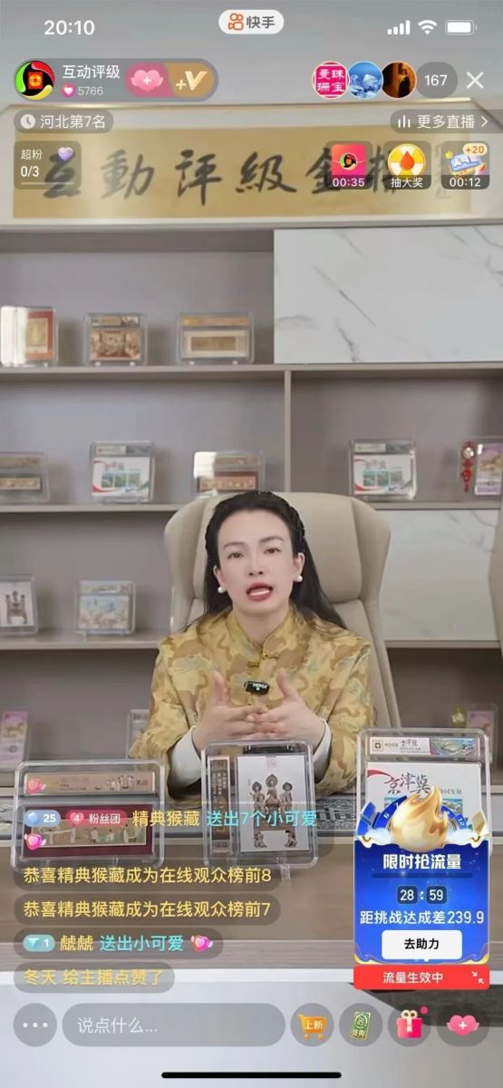 昨晚,互动评级快手直播首秀圆满收官,单场带货成交额突破55 万元,市场反响热烈。直播间人气高涨、氛围热烈,广大藏友对互动金标评级邮品给予高度认可与喜爱。主播团队既专业严谨又轻松幽默,全程讲解细致、互动充分,让众多藏友沉浸其中、全程守候,直至直播圆满结束。