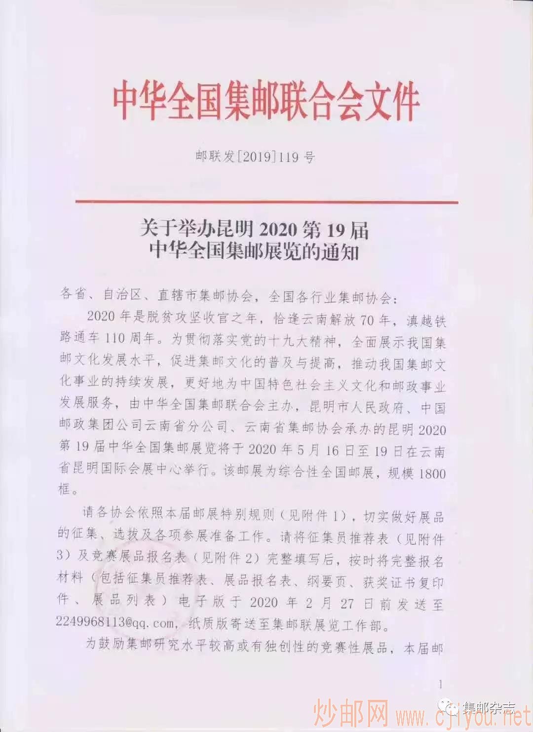 昆明2020第19届中华全国集邮展览明年云南举办 日期:2019-12-18 日前,中华全国集邮联合会下发通知,确定2020年5月16日至19日在云南昆明国际会展中心举办昆明2020第19届中华全国集邮展览。该展览由中华全国集邮联合会主办,昆明市人民政府、中国邮政集团公司云南省分公司、云南省集邮协会承办。本次邮展为全国性综合展览,展览规模1800框。 来源:集邮杂志
