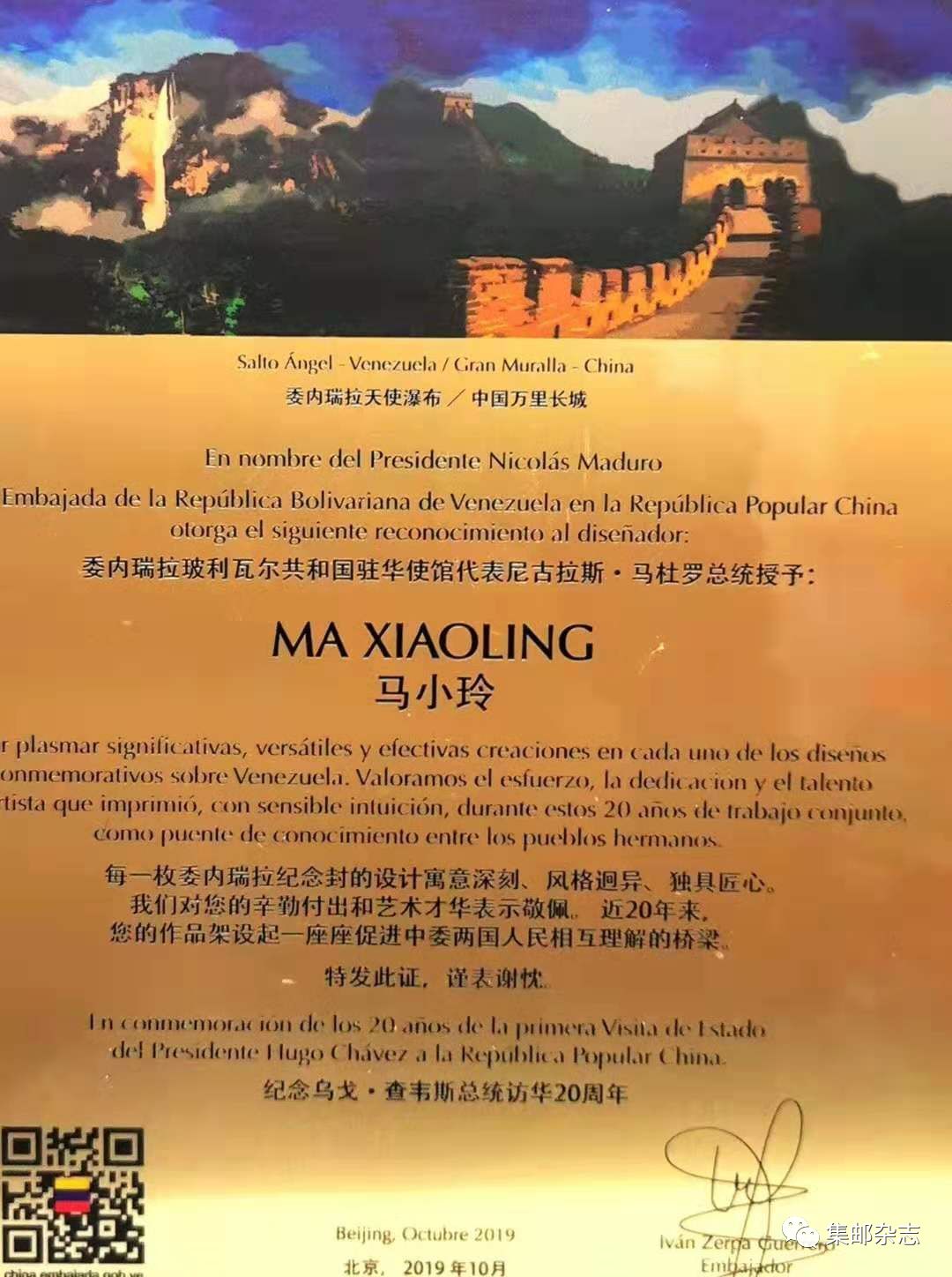 “纪念封架起中委两国人民相互理解的桥梁” 日期:2019-12-19 “每一枚委内瑞拉纪念封的设计寓意深刻、风格迥异、独具匠心。我们对您的辛勤付出和艺术才华表示敬佩。近20年来,您的作品架设起一座座促进中委两国人民相互理解的桥梁。”这段话深深地铭刻在一块特殊的奖牌上。日前,这块特殊的奖牌在委内瑞拉驻华使馆举办的一场特殊仪式上被驻华大使代表总统授与了马小玲。作为中委两国外交系列纪念封的设计者,马小玲在授予仪式结束后表示:奖牌授予的是参与制作这些纪念封的全体工作人员,授予的是全体为两国友谊做出贡献的人们,我只是其中的一员。 据了解,自1999年至今,马小玲设计的与委内瑞拉相关的外交题材纪念封有两国建交25周年、建交30周年、建交40周年和委内瑞拉总统访华纪念等。