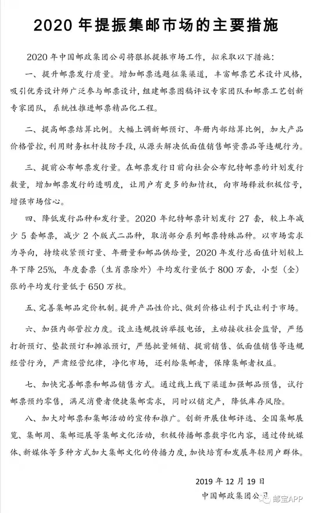 对于当前的市场走势,中国邮政集团公司并没有掉以轻心。根据当前市场情况,在2020年,中国邮政集团公司将从以下三个方面推出系列调控政策,以促进集邮市场进一步好转。