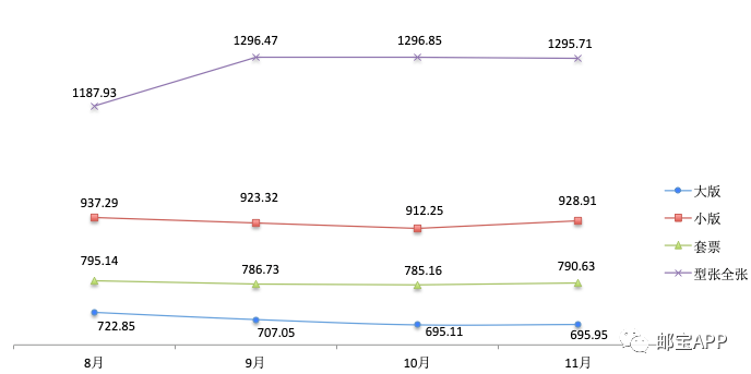新发邮票相较好的表现,特别九月份以来的回升,也带动了存量盘(2018年以及此前发行的特种纪念邮票)的好转。根据邮宝PNMI行情指数,无论是大版、小版,还是套票和型张全张,上半年的明显下跌趋势均得到缓解、维持到了相对稳定的行情。具体来看,大版、小版和套票在9月、10月基本维持了稳定,并在11月有了回升;型张全张则在9月迎来上涨,并在随后的两个月内保持在了这一水平。